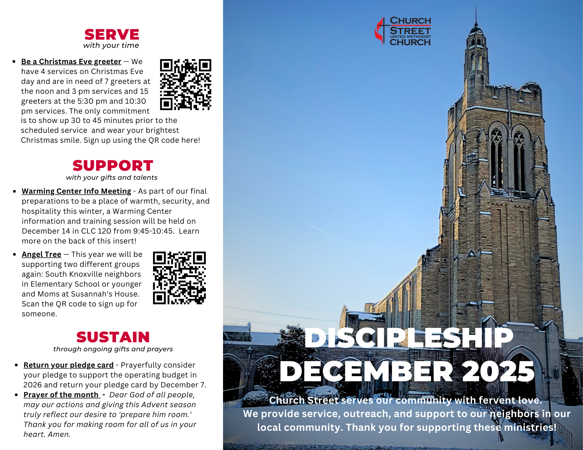 Church Street is a member of the Holston Conference and part of the global United Methodist Church. We participate regularly in activities within the conference, as well as global UMC efforts, such as UMCOR, to bring services to communities in need around the world. UMCOR is the United Methodist Committee on Relief and is the global humanitarian aid and development organization of the United Methodist Church. UMCOR is a nonprofit 5013 organization operated under the auspices of the General Board of Global Ministries.