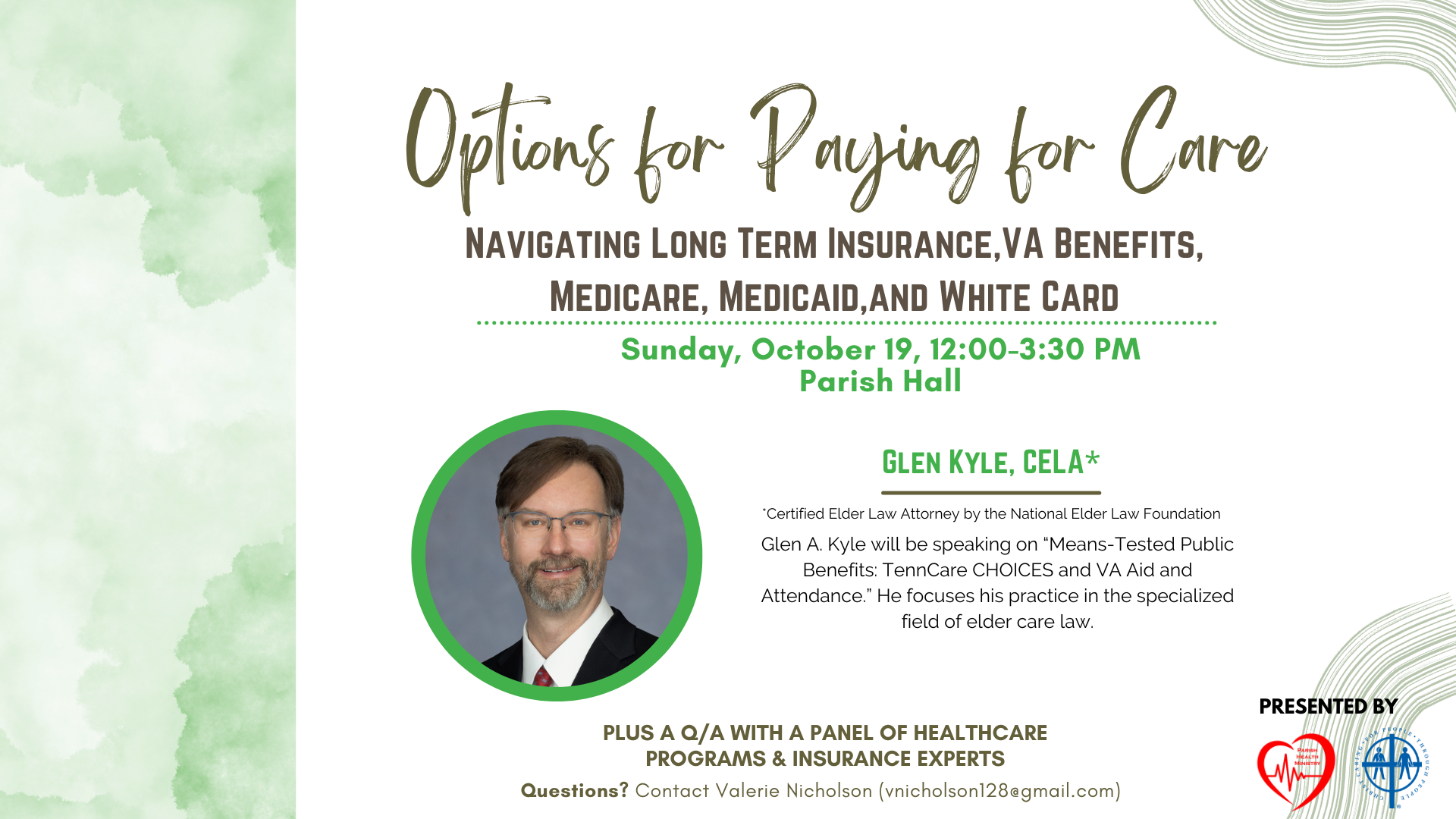 Church Street UMC Parish Health Ministry Team and Stephen Ministry present “Options for Paying for Care: Navigating Long Term Insurance, VA Benefits, Medicare, Medicaid, and White Card” on Sunday, October 19.
